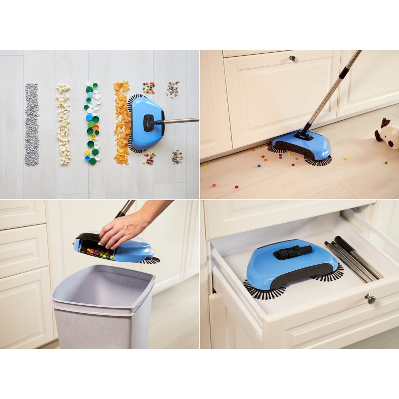 Механический веник для пола заметает не наклоняюсь убирать таким веником в доме очень быстро и качественно, щетка 2 в 1 имеет сделан пилезборника Turbo Tiger позволяет прибраться в доме до трех раз скорее. Щетка собирает различный мусор с помощью 3-х щеток и пилезборника, а ручка удобная поворачивается на 360 ° чтобы обеспечить качественную работу управлять веником. Никаких проводов или батареек просто и легко провести по полу, просто надо прижать к поверхности и увидите как исчезают мусора и волосы с пола.
